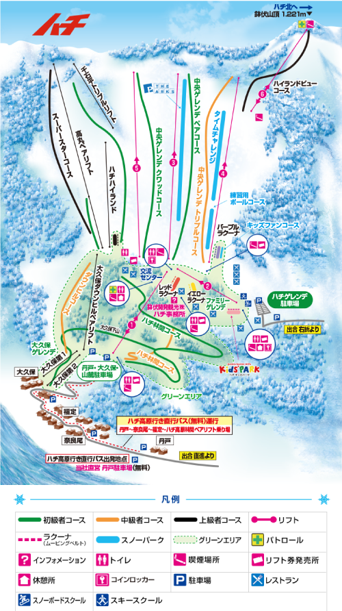 また、中央ゲレンデペアコースは、ビッグスケールにレイアウトされた大小変化のある多彩なアイテムを整備し、初心者から上級者まで納得の関西最大級のスノーパークエリアです!
